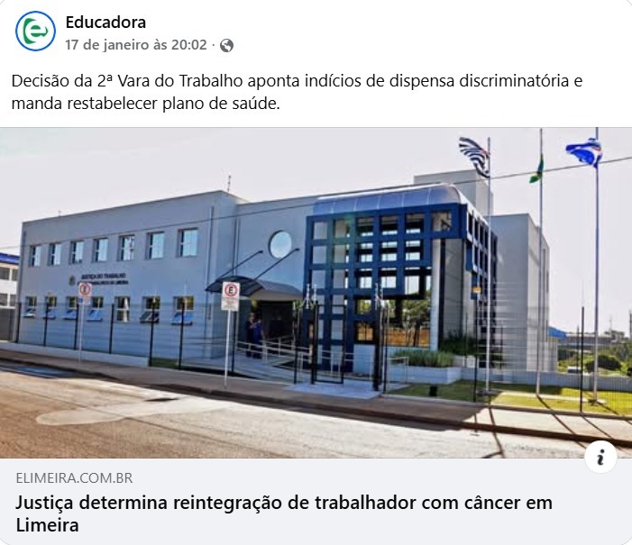A reintegração de um trabalhador da categoria da Alimentação de Limeira, demitido mesmo em tratamento contra um câncer, foi notícia na imprensa local. O fato foi destaque no portal Elimeira da Rádio Educadora de Limeira, no jornal Gazeta de Limeira, no portal Rádio Peão e no portal Diário de Justiça. A história já havia sido […]