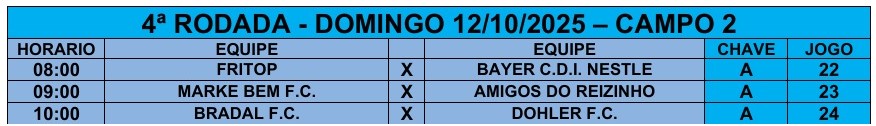 Pela Chave A, os campeões de 2024 da Markbem e os Amigos do Reizinho (Usina Iracema) lideram com 9 pontos cada – três jogos e três vitórias. Os primeiros derrotaram a Dohler neste domingo por 7 a 3, e os segundos venceram o Bayern CDI Nestlé por 7 a 4. Pela Chave B, o Manga Rosa (Ajinomoto) também anotou 9 pontos após vitória contra o Atlético de Madri (Ajinomoto) por 5 a 2. Veja todos os resultados da rodada.