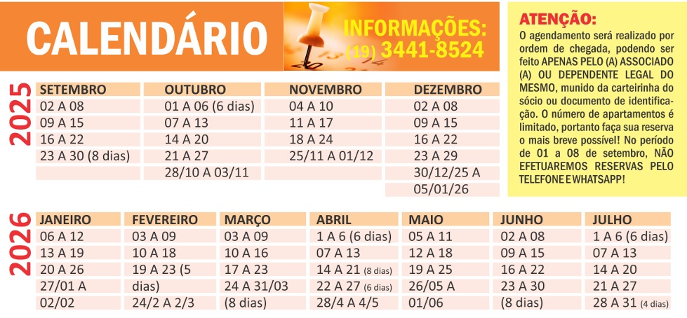 ATENÇÃO: O agendamento será realizado por ordem de chegada, podendo ser feito APENAS PELO (A) ASSOCIADO (A) OU DEPENDENTE LEGAL DO MESMO, munido da carteirinha do sócio ou documento de identificação. O número de apartamentos é limitado, portanto faça sua reserva o mais breve possível! No período de 01 a 08 de setembro, NÃO EFETUAREMOS RESERVAS PELO TELEFONE E WHATSAPP!